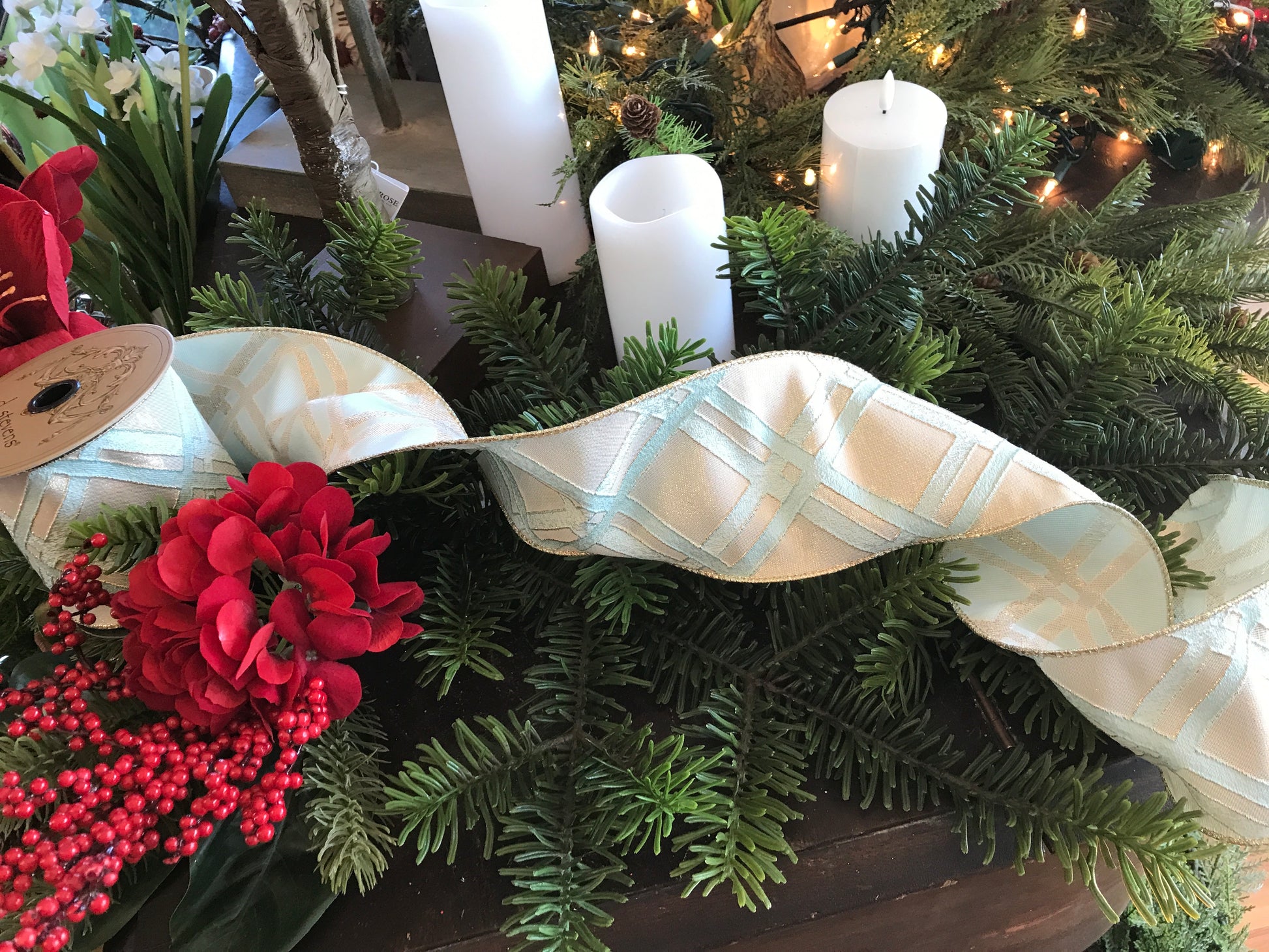 4"x 10yds Jacquard Metallic Lattice, Celadon