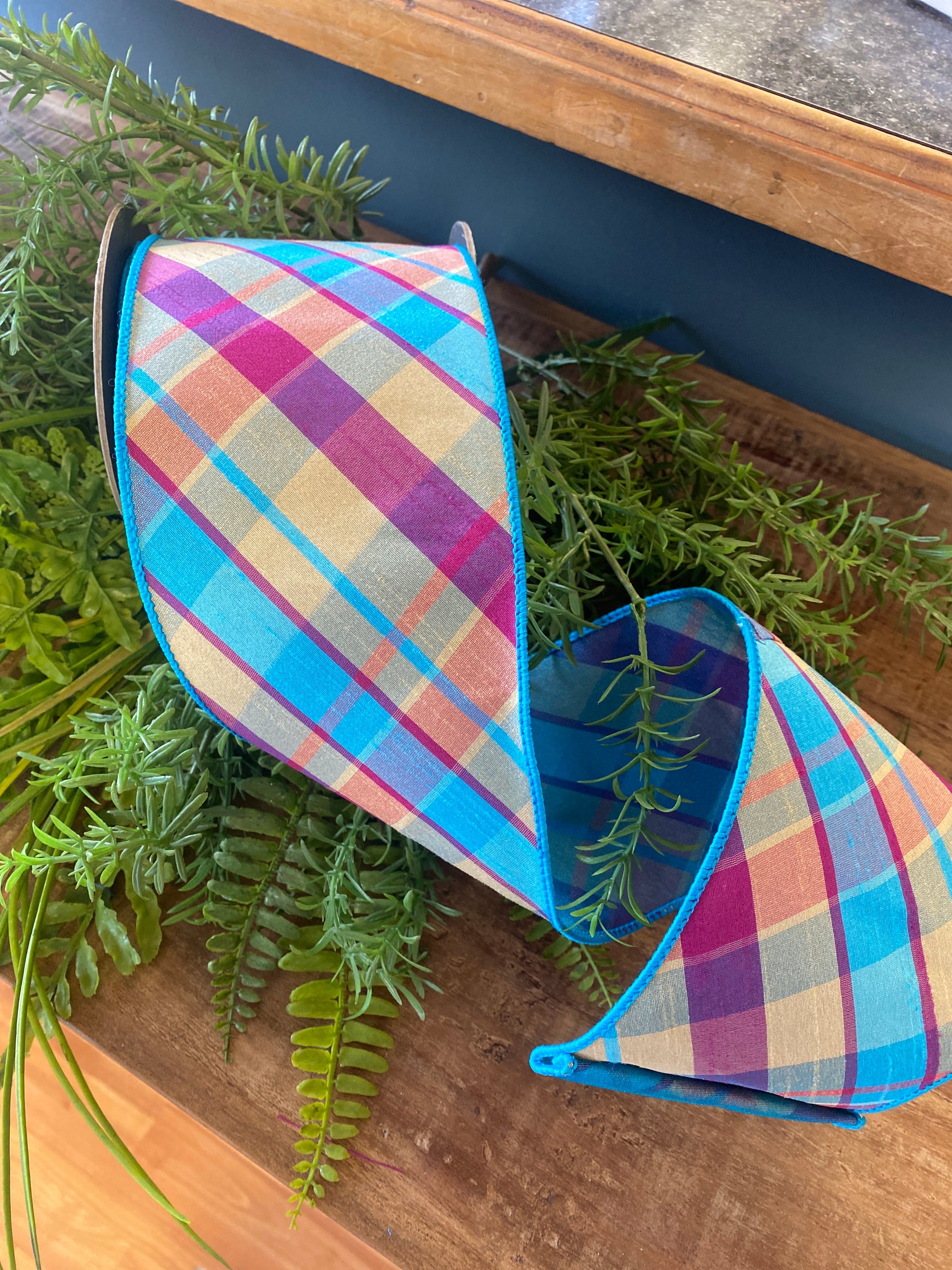 Plaid Turquoise Dupioni Deluxe Tissue Backed Wired Edge Turquoise 4" x5yds