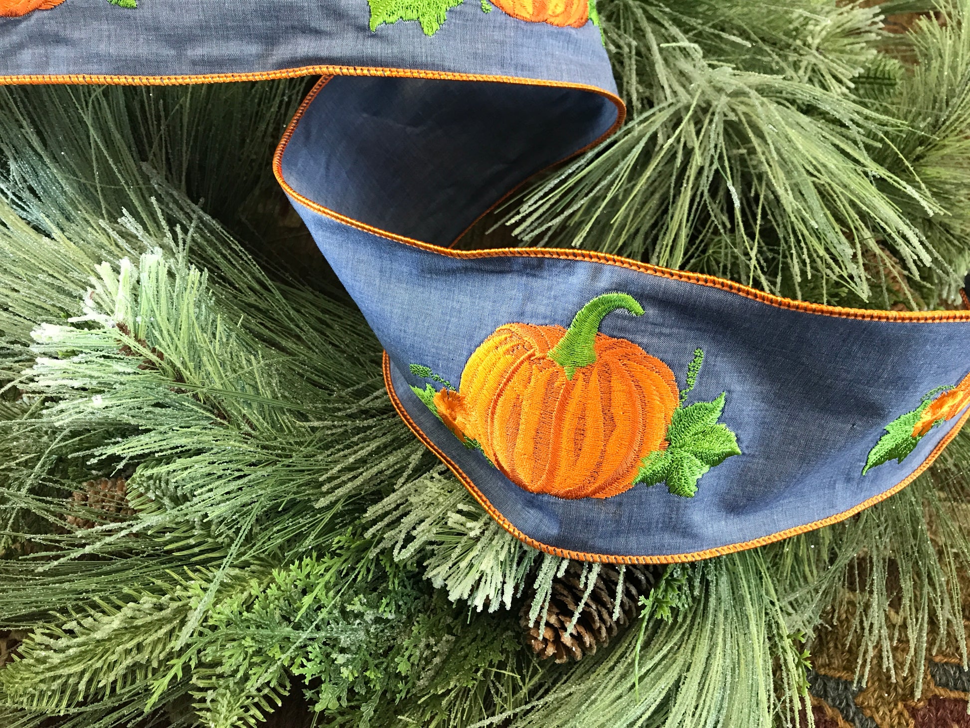 Pumpkin Embroidered Deluxe Wired Edge Ribbon Denim 4”x5yds